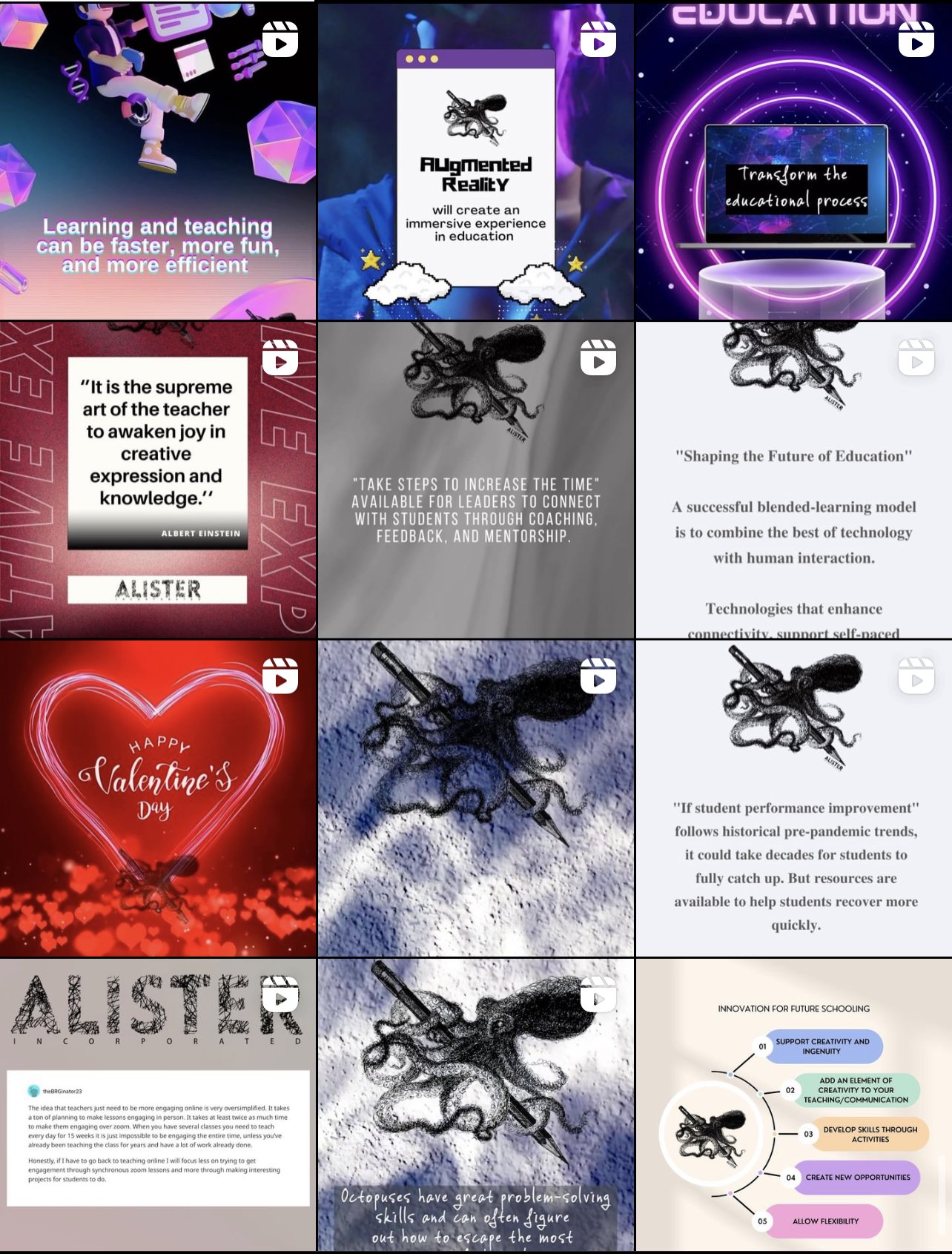 ALISTER provides a safe virtual environment for all students, eliminating any challenges of various and multiethnic student culture. ALISTER provides the true innovative immersive experience that embodies academic intelligence and skills needed to devote to the world today. My position as a Social Media intern I’ve designed, edited, and produced textual, graphic, video, and audio creative pieces for social media channels. Below are some examples that I have accomplished while working with ALISTER.